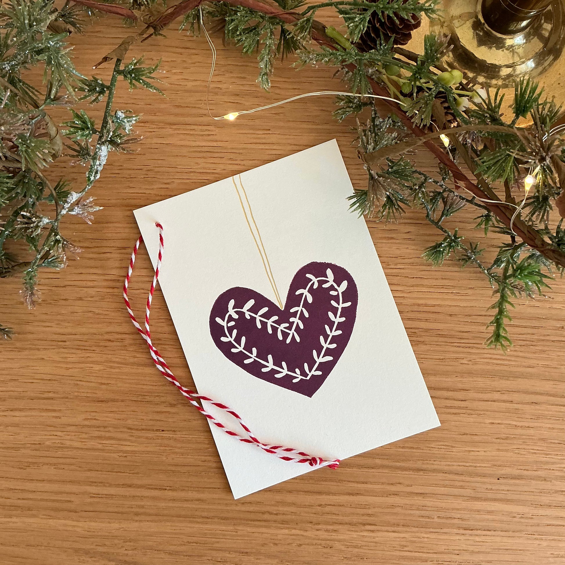 Kortet er trykt i hånden, og gulddetaljerne er malet i hånden. Kortet har en snor i hjørnet, så det fx kan hænges gaven og både bruges som julekort og til/fra-mærke. Til når gaven bare lige skal være lidt ekstra✨
