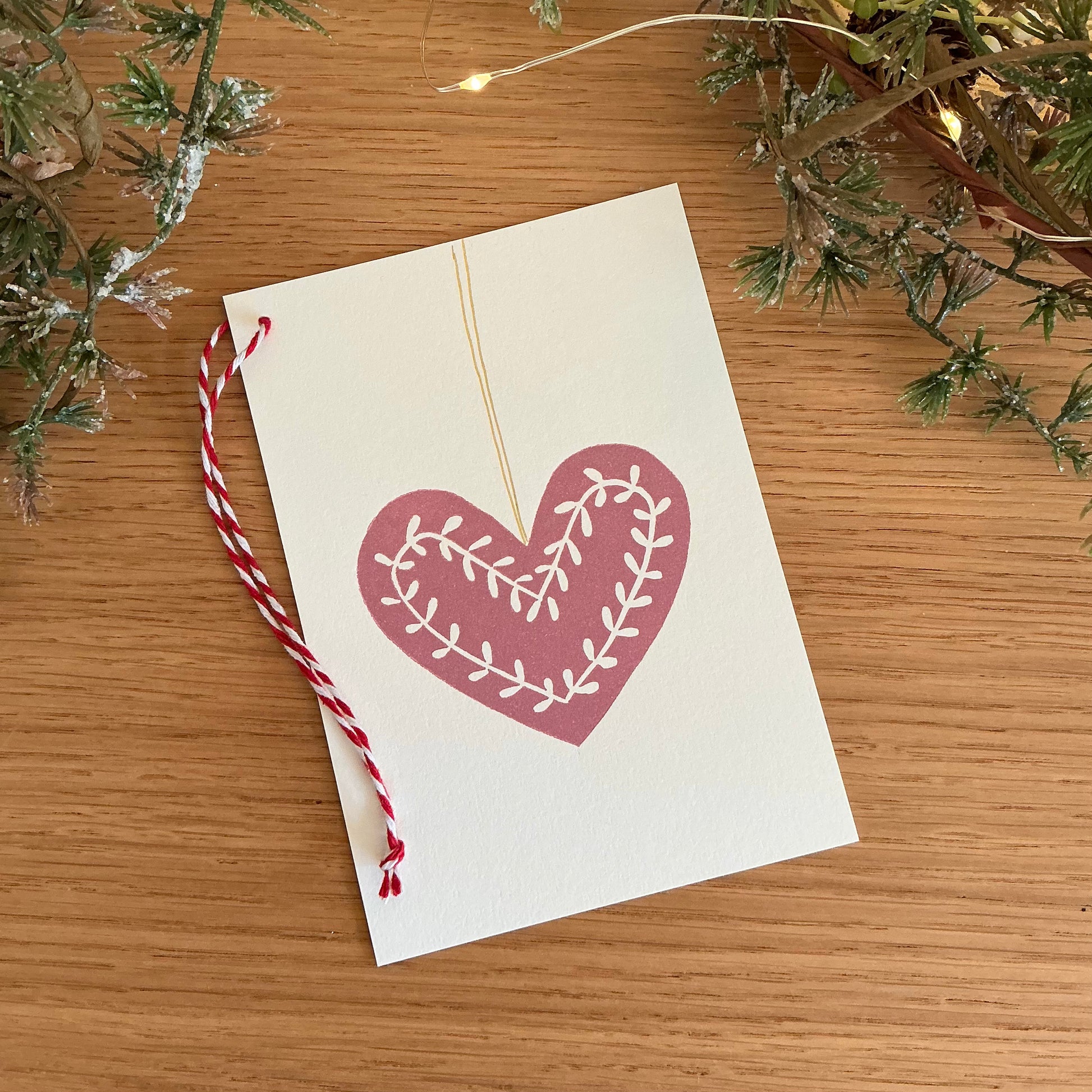 Kortet er trykt i hånden, og gulddetaljerne er malet i hånden. Kortet har en snor i hjørnet, så det fx kan hænges gaven og både bruges som julekort og til/fra-mærke. Til når gaven bare lige skal være lidt ekstra✨