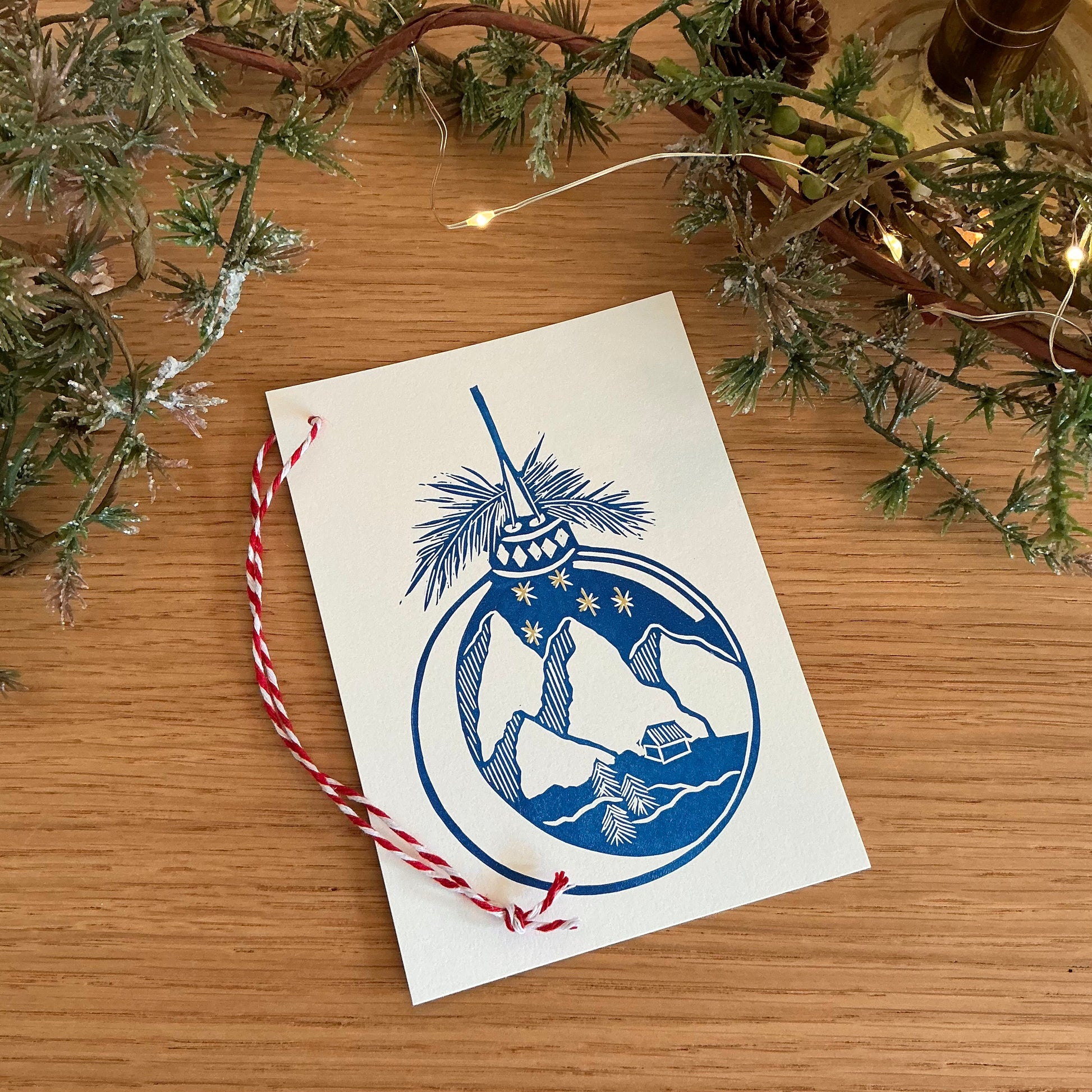 Kortet er trykt i hånden, og gulddetaljerne er malet i hånden. Kortet har en snor i hjørnet, så det fx kan hænges gaven og både bruges som julekort og til/fra-mærke. Til når gaven bare lige skal være lidt ekstra✨