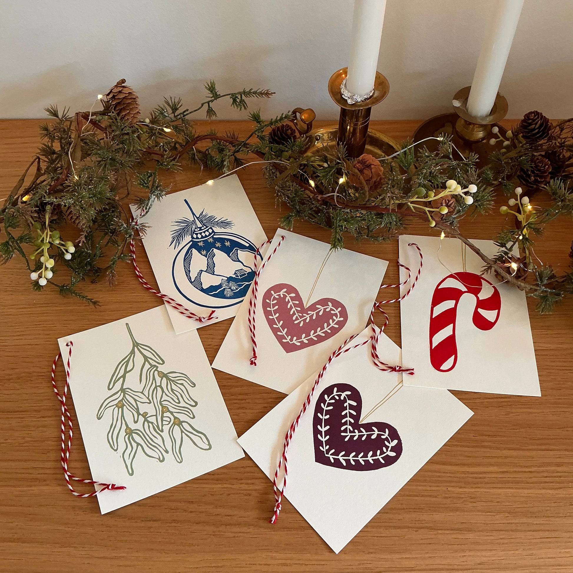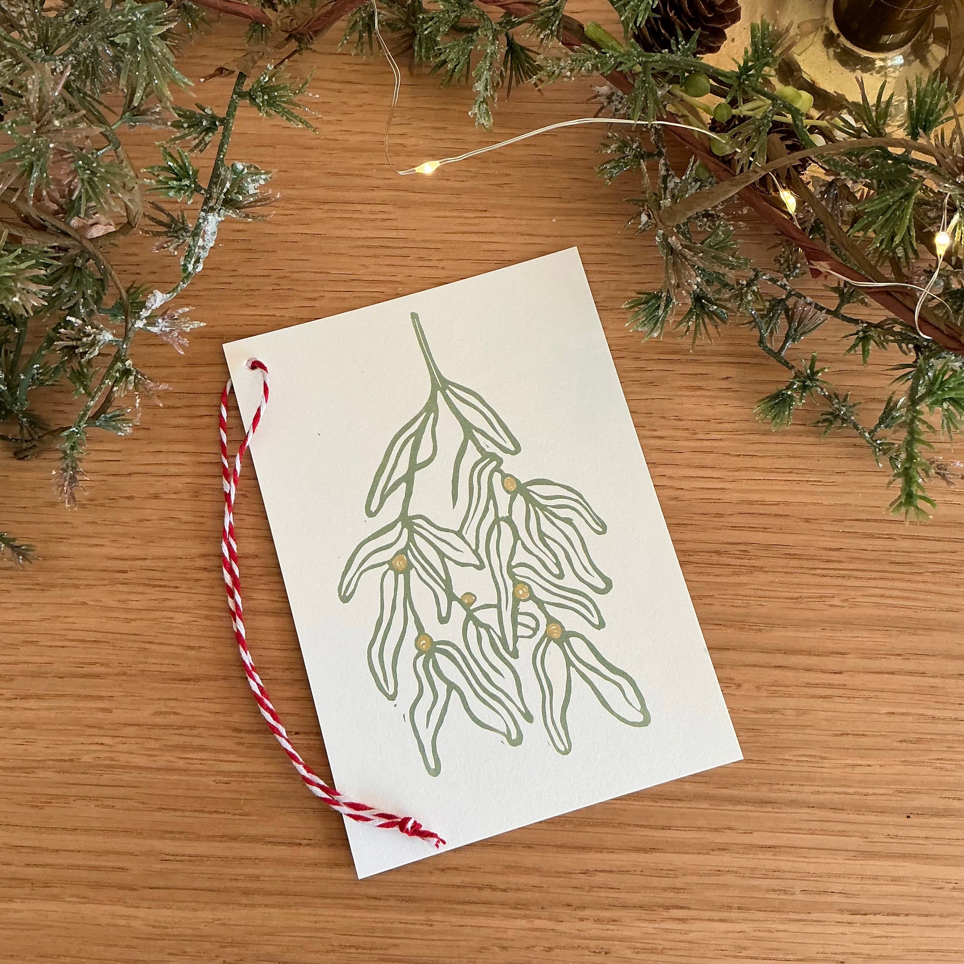 Kortet er trykt i hånden, og gulddetaljerne er malet i hånden. Kortet har en snor i hjørnet, så det fx kan hænges gaven og både bruges som julekort og til/fra-mærke. Til når gaven bare lige skal være lidt ekstra✨