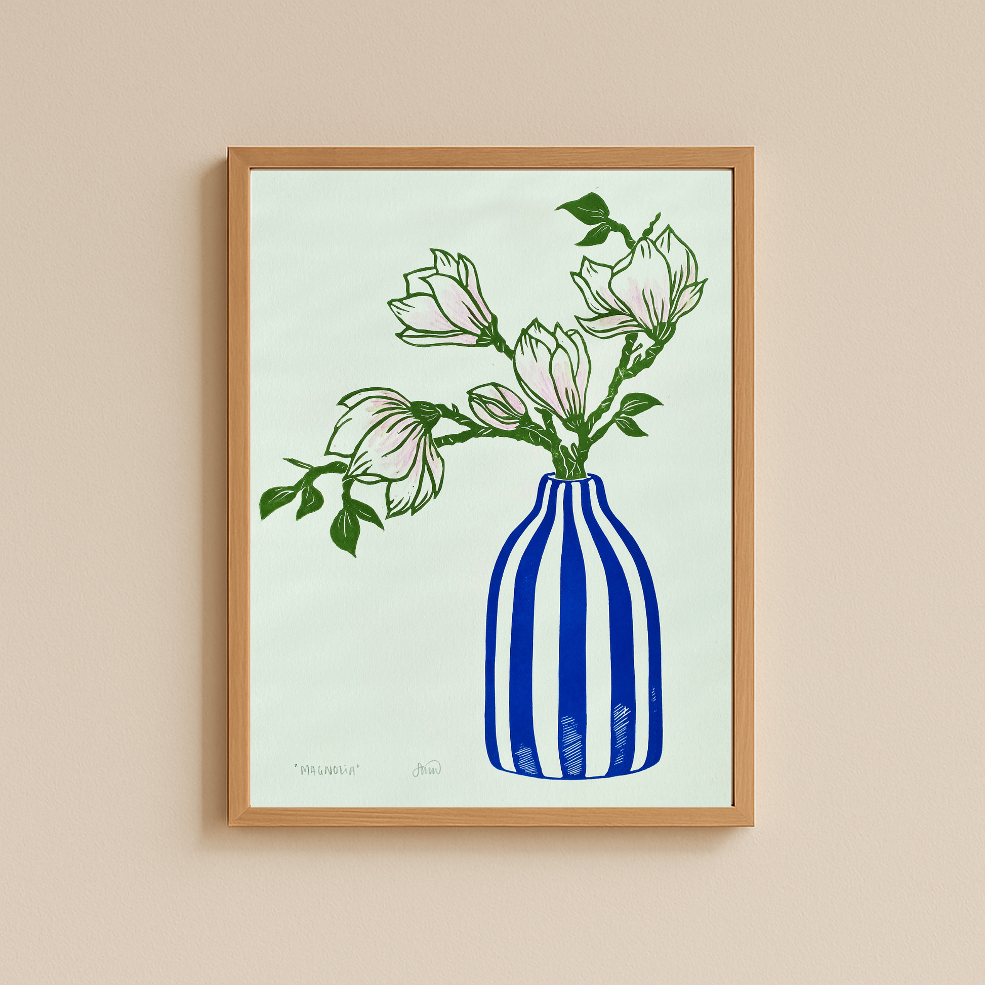 Hvert tryk er skåret og trykt i hånden, måler 30 x 40 cm og er trykt med håndblandet, oliebaseret Cranfield Caligo Ink i to farver. Magnoliablomsternes fine lyserøde nuancer bliver efterfølgende håndmalet med akvarel. Det gør hvert eksemplar helt unikt.