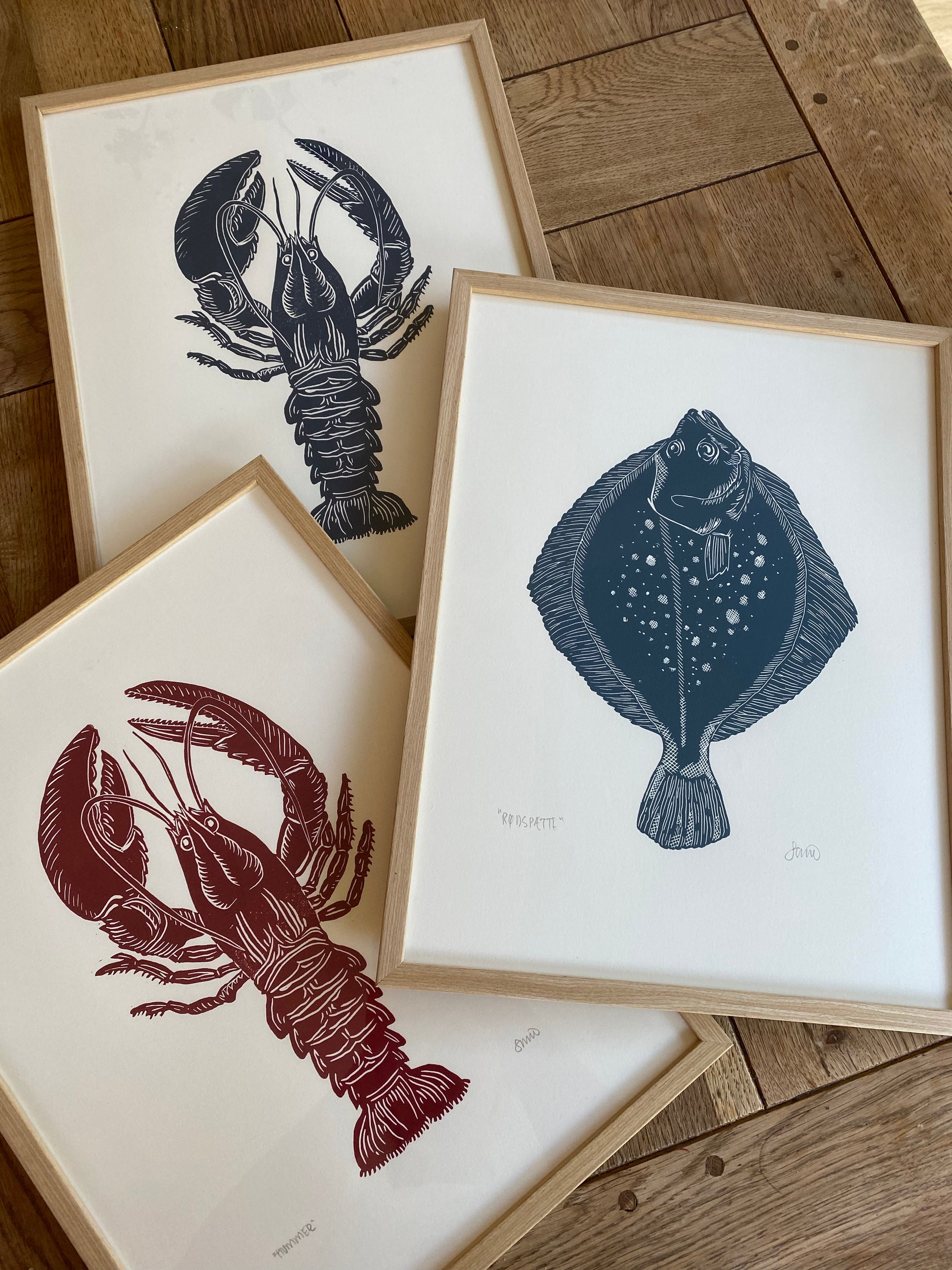 Motivet er skåret og trykt i hånden, så hver enkelt rødpætte får sit eget særlige udtryk. Trykket perfekt ind i køkkenet, sommerhuset eller som gave til en, der elsker livet omkring havet.