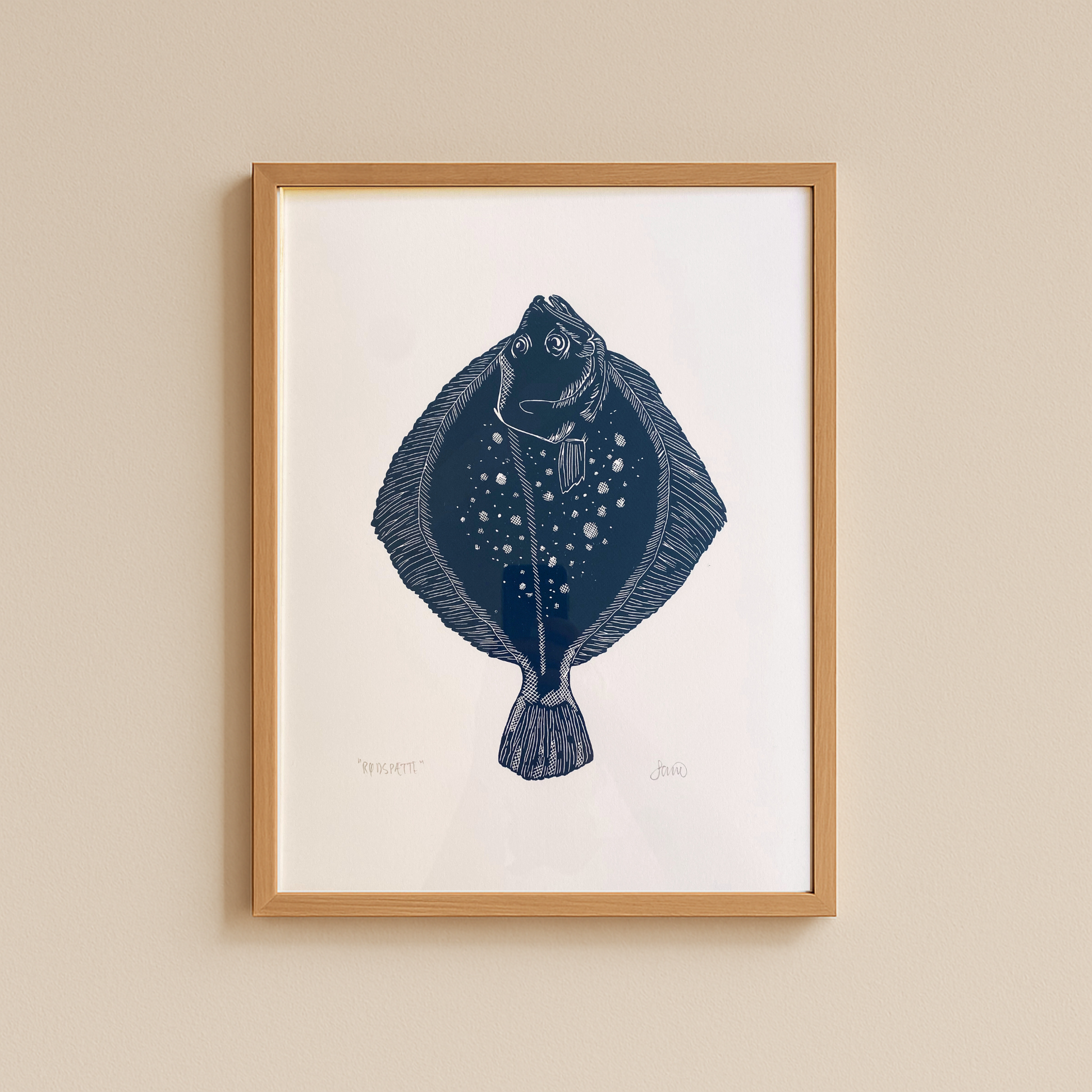 RØDSPÆTTE er et håndlavet linoleumstryk af en af de mest velkendte fisk fra de danske farvande – med sin karakteristiske form og de små prikker, der gør den let at kende.